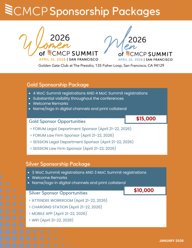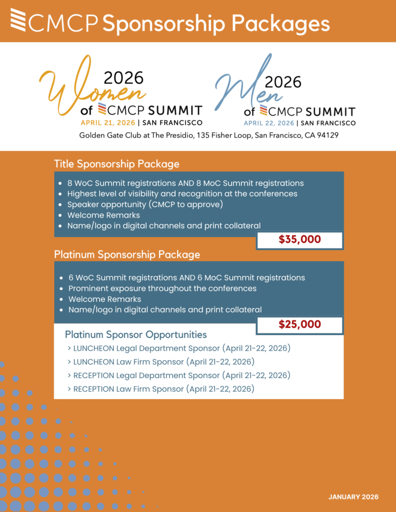 The Women of CMCP Summit is a one-day, live event that seeks to bring together women who are CMCP and business attorneys in California to build a supportive community focused on advancing their careers, business, and personal well-being.