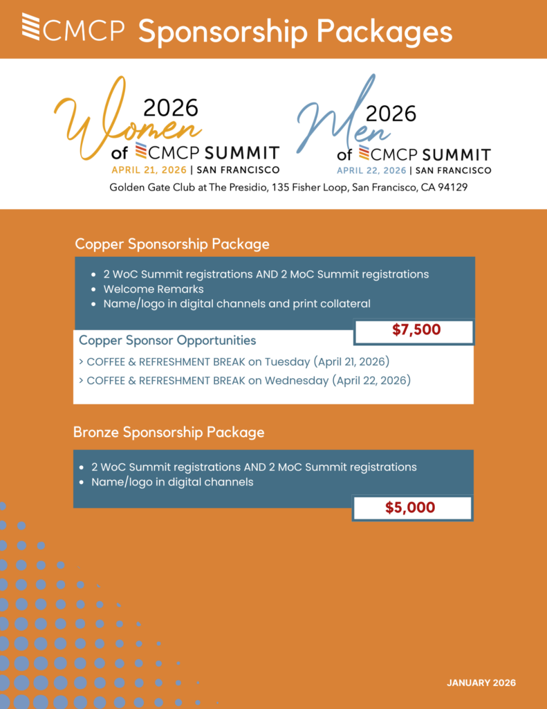 The 2026 Women of CMCP Conference will be held on Tuesday, April 21, 2026 in San Francisco at the Golden Gate Club at The Presidio.